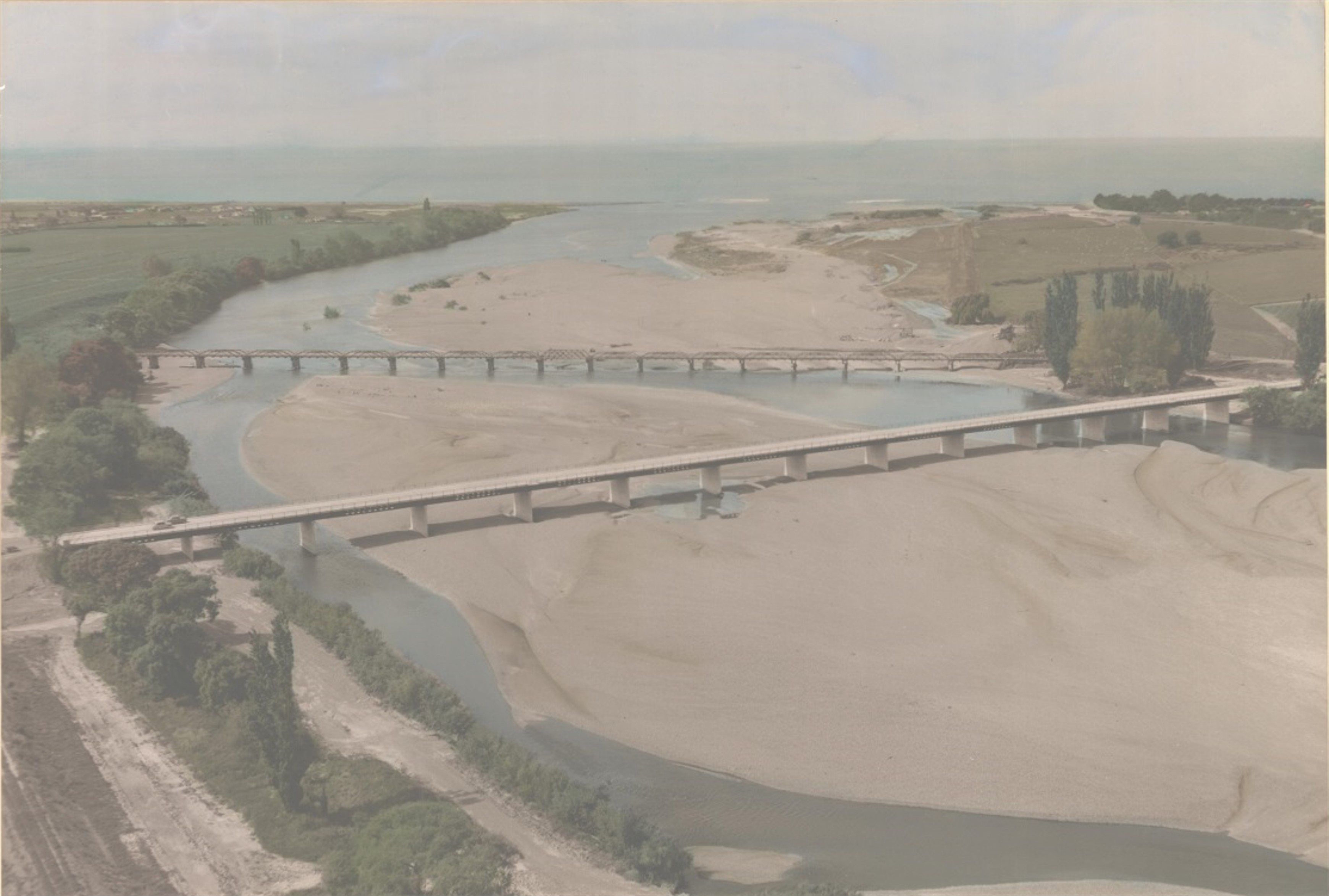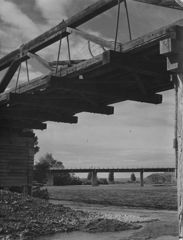 The old bridge had 19 spans, each 60 ft (18m) long with four 30ft (9m) long spans at one end. The piles were each in two sets of four with each span supported by eight piles of 12 x 12 (3.6 x 3.6m) totara, one foot square (30cm). Bill Haig and Paddy O’Connell handled the blacksmith work including making the heavy iron bolts.
