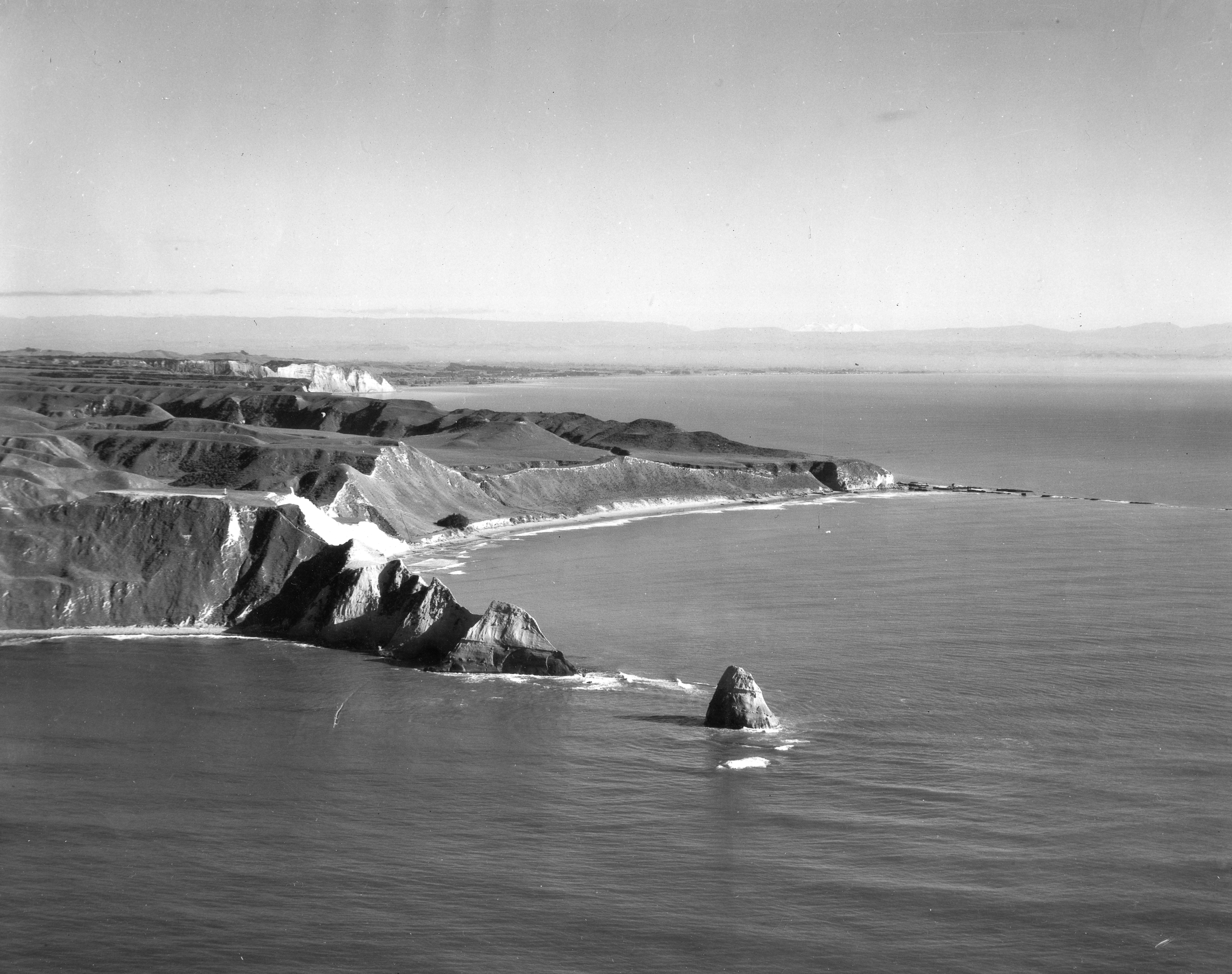 On 15 October, now desperate to trade for water and food, Cook veered south toward the far end of the large bay, where there were steep white cliffs on either side and two large rocks resembling hay stacks near the headland.
