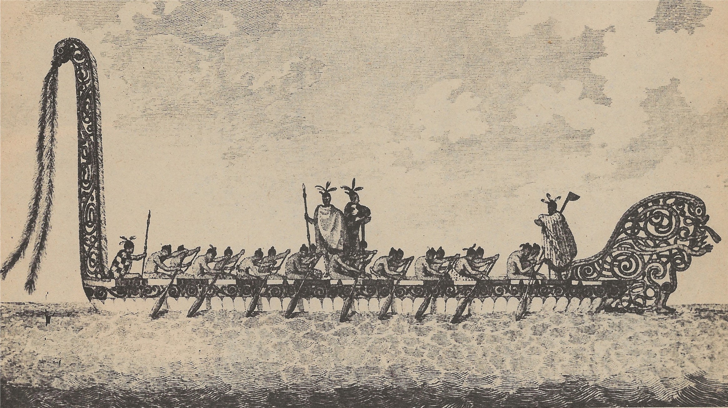 A large canoe approached, followed by seven others containing about 160 men. As they gathered under the Endeavour’s stern, Tupaia communicated with them, “a war dance” was performed and gifts were given by the ship’s crew.